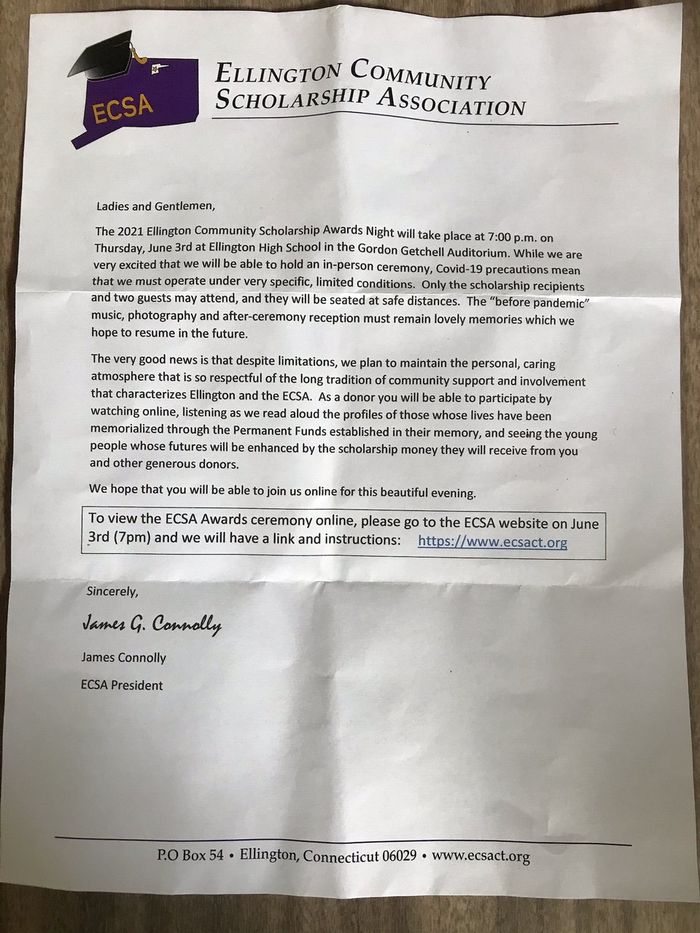 Over the years, ECSA has awarded hundreds of thousands of dollars to Ellington students going on to college or technical and trade schools. Since 1990 alone, ECSA has awarded more than $1,000,000 to Ellington students pursuing a post-secondary education. ECSA is a nonprofit organization with exemption status granted pursuant to section 501(c) (3) of the Federal Internal Revenue Code.